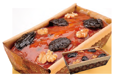 原材料 : 小麦粉 ( 国内製造 )、卵、マーガリン、粉糖、レーズン、くる み、プルーン、杏ジャム、ラム酒、バニラエッセンス、ベーキングパウ ダー、乳化剤、香料、酸化防止剤 (V.E)、着色料 ( カロテン )、ゲル 化剤 ( ペクチン )、酸味料、pH 調整剤 サイズ:170×85×50mm 重さ:約340グラム