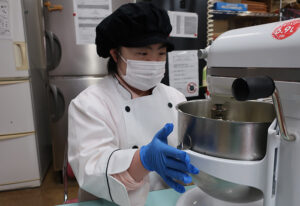 本園での焼き菓子製造では計量から専用ミキサーを使用し生地を混ぜ、型に流すといった ことや袋入れを行なっています。分場では生地から手作りのパンを製造しています。生地の丸めや生地伸ばし、成形といった作業を行なっています。