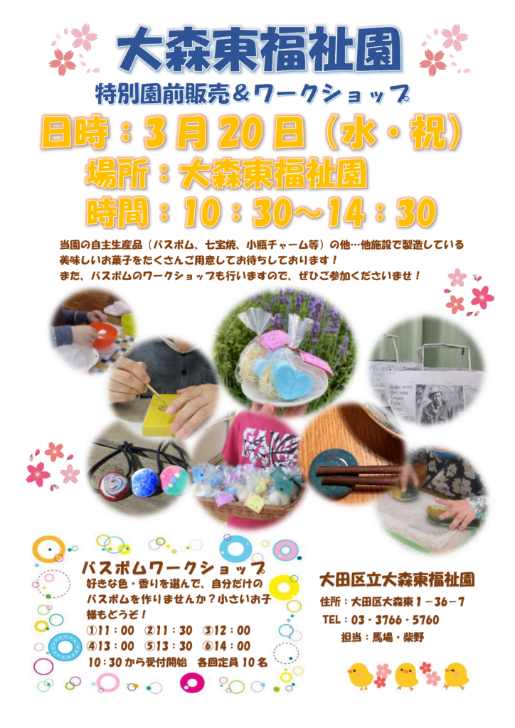 自分好みの色と香りのバスボムが作れるワークショップは、次回3月20日(祝)に大森東福祉園にて開催します。既に計量済みの材料を混ぜるだけなので、小さいお子様も簡単に作る楽しみが味わえます。